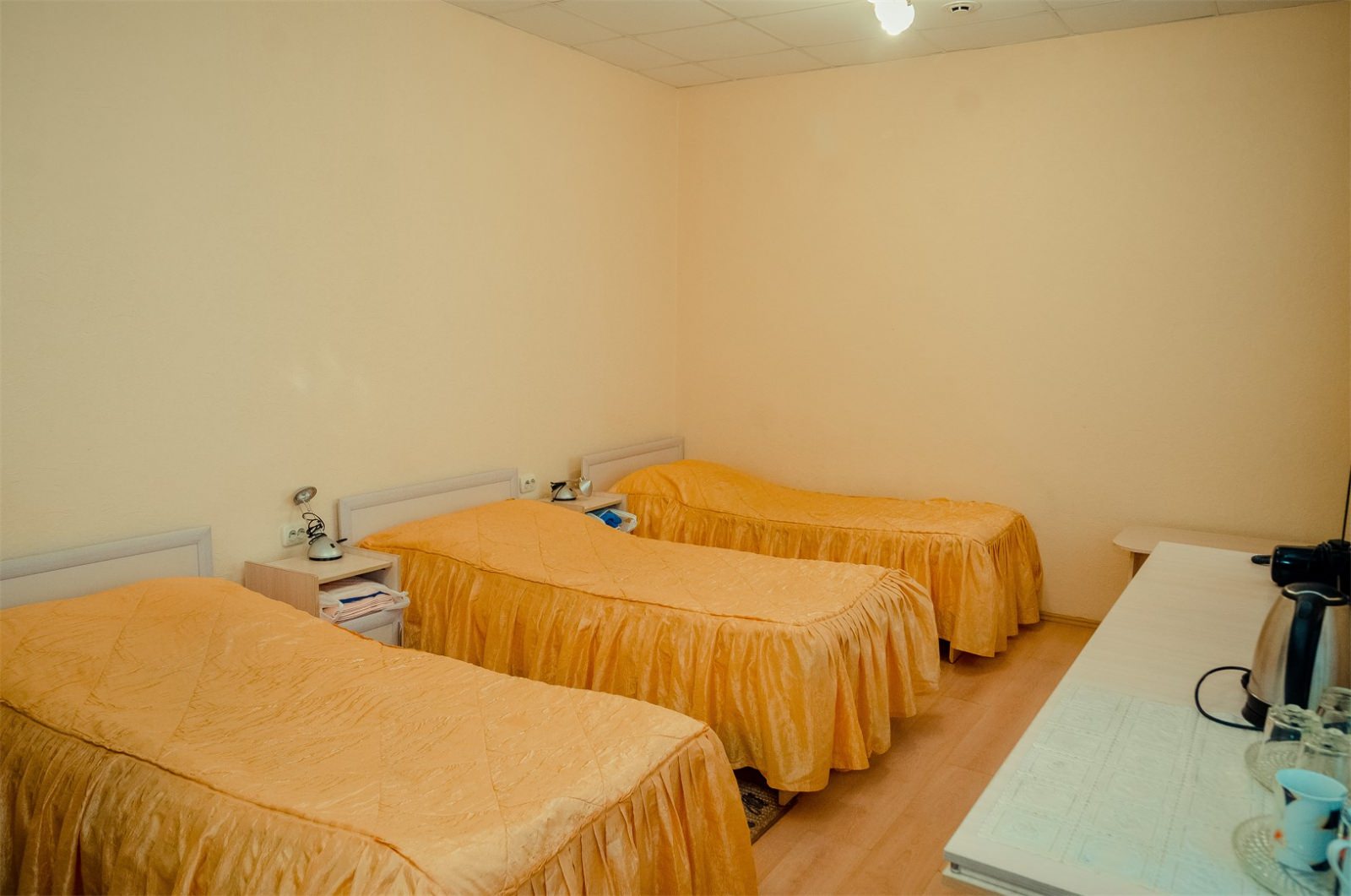 В номере три односпальные кровати, просторный санузел с душевой кабиной. Здесь есть все необходимое для приятного отдыха. С балкона открывается прекрасный вид на Волгу или сосновый бор (средний этаж). Номер с тремя кроватями - это оптимальный выбор для размещения целой семьи